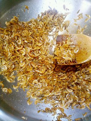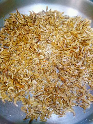 小火,锅中无水无油,将洗净的干河虾倒入锅中,不停翻炒,炒至干燥。