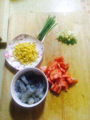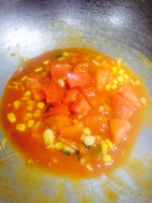 将西红柿熬出汁,再加少许番茄酱和盐,虾仁易熟,所以先熬好番茄汁玉米粒的添加是为了丰富口感