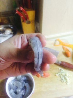 买鲜虾破壳,用刀子在虾背k滑开去虾线(这一步做之前要考虑好,因为有可能以后不去虾线吃虾都会觉得怪怪的)
