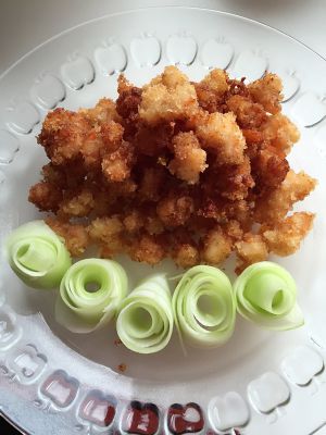 大虾洗净去皮去虾线,切块用盐腌制几分钟以后裹上鸡蛋清然后裹上面包糠油炸,两面金黄即可