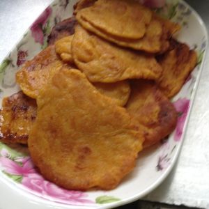 锅里放油。用勺子舀一勺压成图状。煎至金黄色就可以出锅啦。
