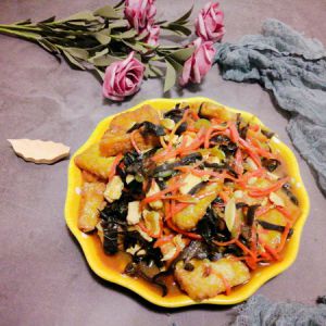 盘中备料,木耳,胡萝卜,青椒切丝备用