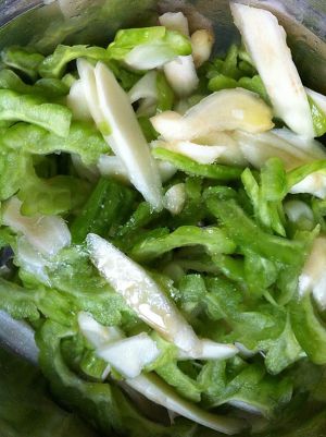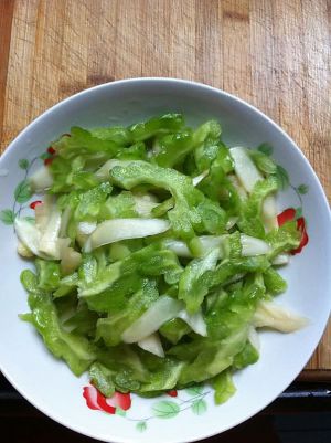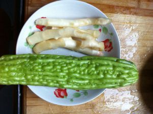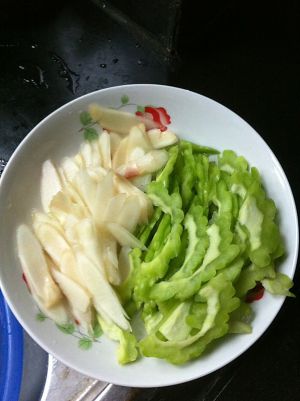 腌制后的仔姜苦瓜会有水分,一定要把水倒干净.然后撒上味精、少量白糖、再淋上麻油拌匀即可