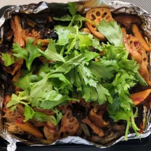 处理配菜,豆腐皮切宽条,莲藕切薄片,芹菜切段,香菇切片,红薯切条,黑木耳和腐竹提前泡发