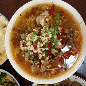 郫县豆瓣酱下锅,能吃点辣椒的两勺就行,小炒一下,加水,等水烧开,加入里脊肉,肉熟了即可盛出