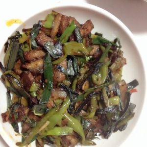 热锅放油,加葱姜蒜爆炒青椒后加蒜苗一起翻炒,起锅待用。