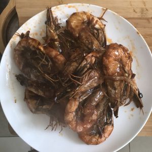 锅内留底油放入葱姜蒜煸炒爆香,倒入调好的料汁。倒入刚炸好的虾,加入一瓶盖料酒,盖上锅盖,中小火焖烧至收汁,出锅前视情况加盐即可。