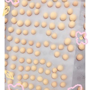 然后就一个一个揉成小球球,摆盘,摆盘需要留点空隙,180度烤15分钟左右,烤的时候看见小馒头变成白白的小胖子哦