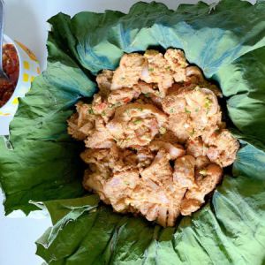 新鲜荷叶洗净,放入深碗中,土豆茄子切滚刀块,加入少许盐和粘米粉拌匀,放在荷叶上垫底。