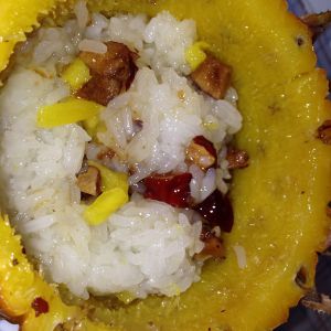 熟米,枣碎,菠萝块,白糖一起装入菠萝壳中,上锅蒸几分钟就好