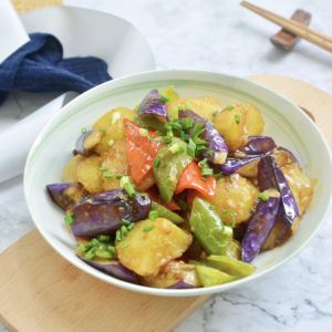 锅内加入宽油,加热至6成热,将土豆和茄子炸熟