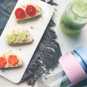 馒头切成片,胡萝卜、青瓜用模具刻成花朵形状.小番茄直接切片即可.