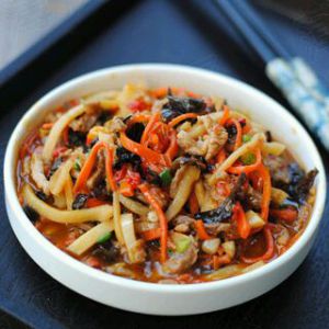 下入肉丝,倒入调好的酱汁,翻炒2min左右即可