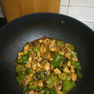 倒油,倒鸡肉,放2勺老干妈,炒至鸡肉不透明。老抽1勺上色,继续炒1分钟,倒入洋葱,青椒,放2勺生抽,1鸡精,1味精,1盐,1孜然,大火3分钟,出锅。好吃
