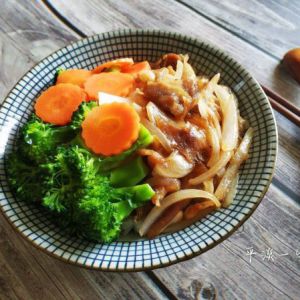 盛一碗米饭,铺上炒好的肥牛,再摆上之前焯熟的西兰花和胡萝卜,一碗美味快手的黑椒肥牛饭就做好了。