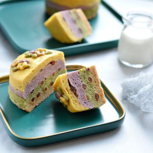 馒头饱满,装饰花朵也没有脱落,脱膜,可切块直接食用,葡萄干又香又甜,为多彩馒头增色不少。