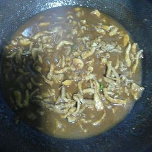 放入锅内油,烧开,放入甜面酱,加入适量清水,放一勺糖,到料酒,用勺子搅匀,然后把肉丝倒入锅中,大火收汁即可。