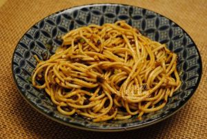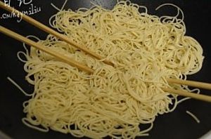 往沥干的面条中加入3大匙香油,用筷子把面条充分挑散拌匀,确保面条不会粘连。