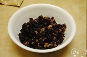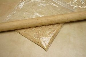 将熟花生仁放入保鲜袋中,用擀面成碎粒。