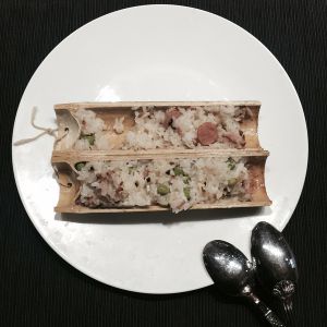 竹筒提前洗净准备好,用皮筋捆住,避免蒸制过程中馅料漏出,将拌好的混合物塞入竹筒内,塞进一部分时,可将筒放入手心dundun,让填充物更瓷实,最后用木塞堵住封口,如果购买竹筒时没有配备木塞,可用白菜裹住封口。