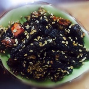 倒入牛肉,一起油炸,一定要放酱油,最后放芝麻,完工