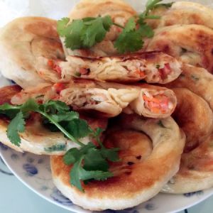 把醒好的面剂子放在面板上擀开,然后用手抻的薄薄的,当然是越薄越好,由上至下卷起。