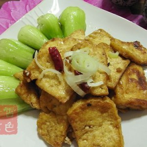 豆腐片盛出后,锅内放干辣椒、葱花炒香,然后放入菜心翻炒两下,再放入金黄的豆腐片翻炒;