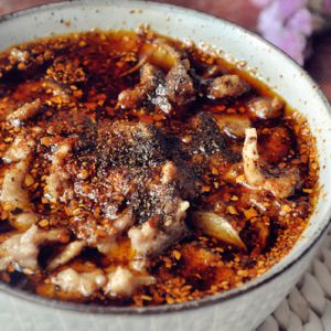 重新洗锅,烧少许油,油开后关火,在盛菜的碗里撒上辣椒粉和花椒粉,然后将油迅速淋在面上,淋面这一部很重要,油必须要烧开,但油太热辣椒粉会糊掉,因此关火后有30秒左右的时间差。烧热的油倒入碗中,辣椒粉和花椒粉立刻被油浸炸的吱吱声作响,香味浓烈。