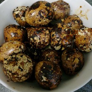 把压碎的鹌鹑蛋放入锅内,放八角、香叶、桂皮,倒入生抽、少许老抽(调色),加水没过鹌鹑蛋,开大火,煮沸后转小火,时间越长越入味,我喜欢烧2~3个小时后关火,第二天再用小火煮,这样比较入味,连蛋黄也有味。