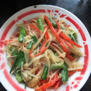 再倒入土豆丝,彩椒,放点白醋,鸡精,盐,生抽,翻炒即可