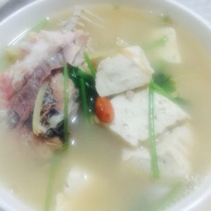 把鱼豆腐捞出的料放砂锅里,加热水大火烧开,小火慢炖40分钟左右,最后十分钟放枸杞,出锅前放香菜