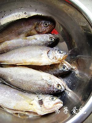 小黄鱼内脏去掉,洗干净,撒盐,腌制一段时间