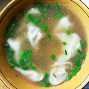 包的过程中可同时坐锅烧水,馄饨包好水也烧好了,不用等待便可下锅。煮馄饨就不用说方法了,跟饺子一样。馄饨在锅里沐浴的同时,可以备汤料了。碗里放紫菜、虾皮、葱花,适量盐、酱油、醋,将煮熟的馄饨与煮馄饨的水倒入碗中即可。因为家里没紫菜和虾皮了,我仅仅用了葱叶碎,一样美味。好了,一碗热情腾腾,喷香扑鼻的馄饨做好了。大快朵颐吧