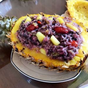 到时间后将饭装到菠萝里,盖上另外三分之一菠萝盖放到蒸锅里,蒸十五分钟,使菠萝味加倍激发出来