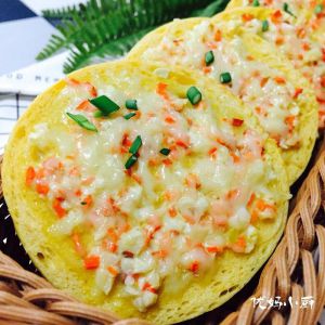放在切好的馒头片上,热勺加少油煎至底部金黄。也可以用烤箱170度烤10分钟。
