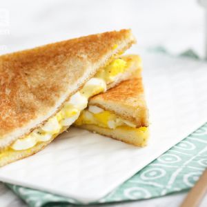 吐司切去边,一切为二,吐司面包上放入鸡蛋色拉,再盖上另一片吐司面包。