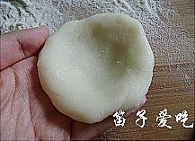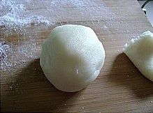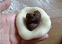 在手上拍点糕粉防粘,然后象包月饼一样用冰皮把豆沙包起来,并慢慢往上推。