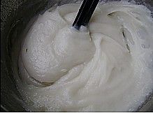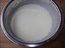 在盆里倒入牛奶、糖粉、色拉油搅拌均匀。