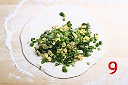 放上适量的馅(放馅的时候,因为这是素馅不容易放,多放几次压实一些)。