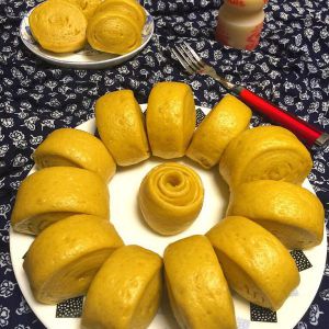 称好中筋面粉,南瓜粉,糖~放入干净无水的盆里,混合~