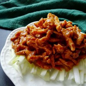 锅内放少量油,倒入两种酱料翻炒几下,然后放入肉丝,翻炒让肉丝均匀上色,最后放入少量白糖调味儿,即可出锅。味道很正宗。