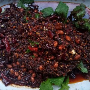 干辣椒洗尽切断,鲜薄荷洗尽滤水备用,姜蒜切蓉,花生米炸好备用。将料酒、生抽、蚝油、胡椒粉、孜然粉、盐、鱼豉油调和成酱汁备用。