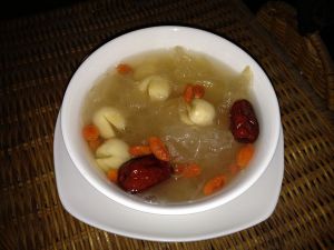 等银耳煲软后,加入洗净的红枣、枸杞,加盖煲10分钟左右,就可以解馋了。