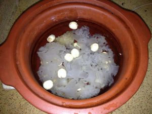 将银耳、莲子用冷水泡30分钟。银耳泡发后去黄色蒂,莲子去绿色芯。