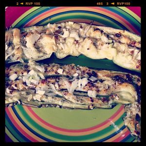 茄子对半切,切面上在横几刀。将蒜茸油均匀涂在茄子切面上,撒上辣椒面