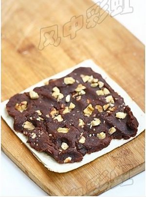 蒸好的春饼皮摊开,抹一层红豆馅,再撒上少许核桃仁,并将核桃仁压入红豆馅内。豆馅不要涂得太厚太满,四边要留一些空隙