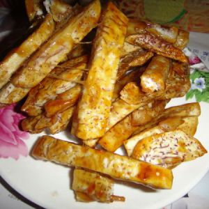 待糖浆完全溶解,搅拌至金黄色。放入炸好的芋头条,搅拌就可以了