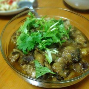 锅中余油不要太多,下蒜末爆香,放肉,加一大勺豆瓣酱开炒,肉发白时加酱油再以老抽上色,将之前的茄子加入煸炒,加适量盐调味后即可出锅。然后撒香菜就好了。