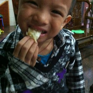 用擀面杖把它擀平然后放葱花油。一定要压扁。然后再卷起来,想起来再压成饼状。