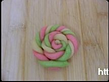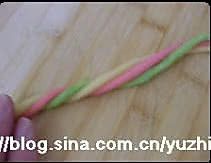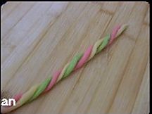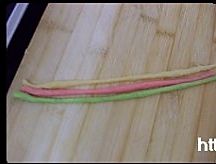将黄红绿面团各取5克的小面团,搓成一样粗细的长条